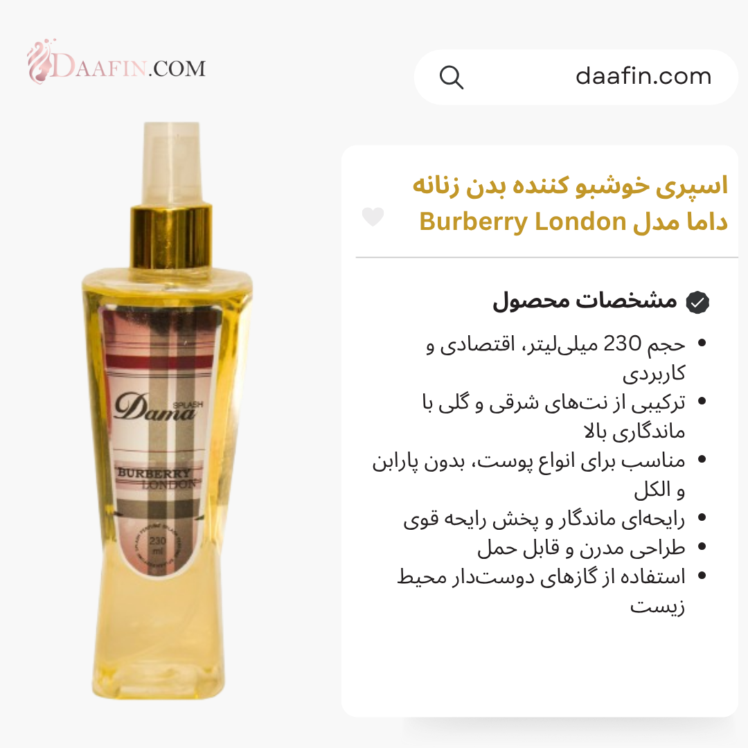 اسپری بدن زنانه داما مدل Burberry London با طراحی مدرن و زیبا عرضه شده است که توجه هر مصرفکنندهای را به خود جلب میکند. بستهبندی این محصول به گونهای طراحی شده که علاوه بر ظرافت، استفاده از آن نیز بسیار راحت باشد. بطری اسپری با رنگبندی جذاب و الهام گرفته از رایحه Burberry London، حس لوکس بودن را به کاربر منتقل میکند. همچنین اندازه و طراحی ارگونومیک بطری باعث میشود حمل و استفاده از آن در کیف یا سفر به راحتی امکانپذیر باشد.