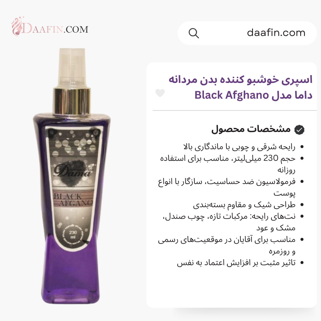 اسپری خوشبو کننده بدن مردانه داما مدل Black Afghano با رایحهای جذاب و منحصر به فرد، تجربهای متفاوت از حس طراوت و جذابیت را ارائه میدهد. این اسپری با الهام از رایحههای شرقی و چوبی، ترکیبی خاص از نتهای عطر را به کار گرفته است که با ماندگاری بالا و تطابق گسترده با سلیقههای مختلف، جایگاه ویژهای در میان محصولات مشابه دارد. رایحه این اسپری به گونهای طراحی شده است که نه تنها برای استفاده روزانه مناسب باشد، بلکه در موقعیتهای خاص و رسمی نیز جلوهای خاص به شخصیت شما ببخشد.