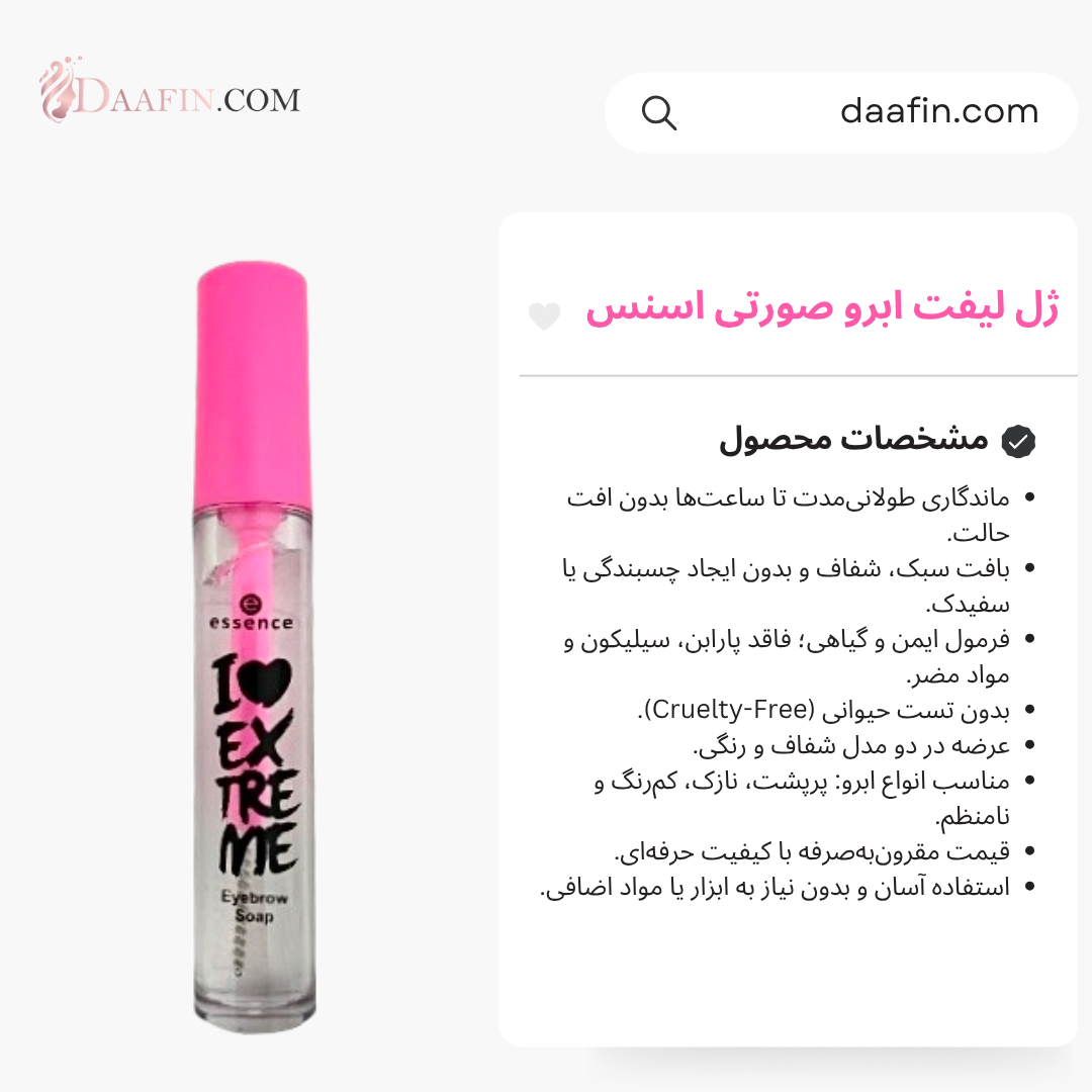 این محصول با فرمولاسیون سبک و ماندگار، به شما امکان میدهد ابروها را در مدت زمان کوتاهی فرم داده، لیفت کنید و ظاهری طبیعی و بینقص به آنها ببخشید. چه ابروهای پرپشت داشته باشید و چه ابروهای نازک و کمحجم، ژل لیفت ابرو اسنس با ویژگیهای منحصربهفرد خود، بهترین همراه شما برای دستیابی به ظاهری آراسته و حرفهای خواهد بود.