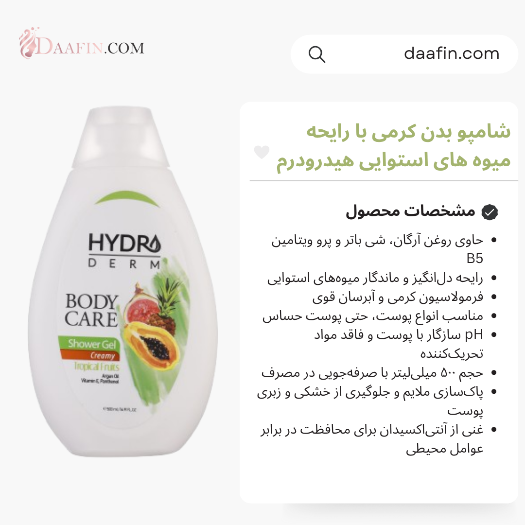 شامپو بدن کرمی هیدرودرم با رایحه میوههای استوایی، یکی از محصولات شاخص این برند معتبر ایرانی است که با ترکیب تجربه چندین ساله در تولید محصولات مراقبت از پوست و استفاده از فرمولاسیون پیشرفته، طراحی شده است. این شامپو علاوه بر پاکسازی پوست، بهصورت همزمان آن را آبرسانی و تغذیه کرده و با رایحهای تازه و گرمسیری، تجربهای متفاوت از استحمام روزانه را برای مصرفکنندگان رقم میزند.