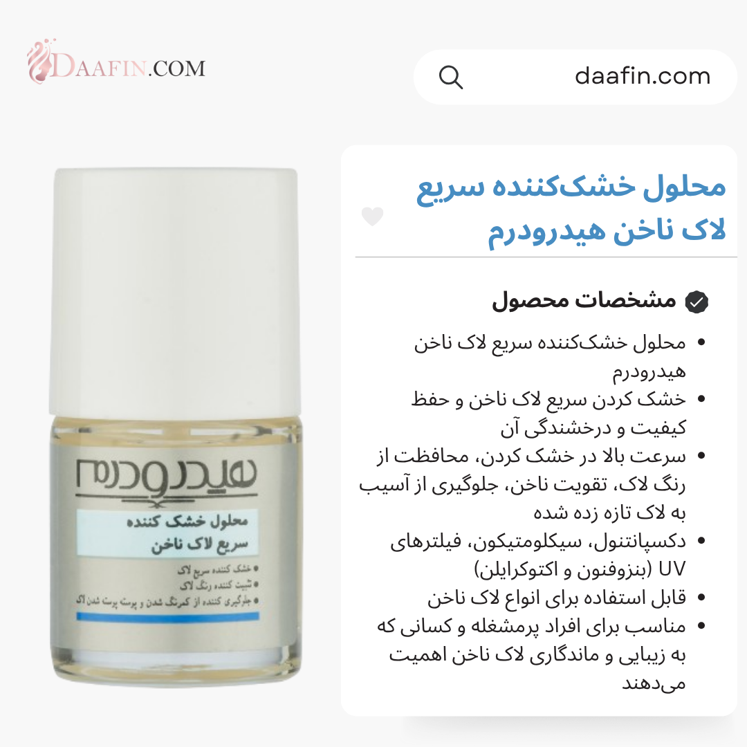 محلول خشککننده هیدرودرم با استفاده از ترکیبات علمی و تخصصی، به سرعت لاک ناخن را خشک میکند و از آسیبدیدگی آن جلوگیری میکند. این فرمولاسیون نه تنها به تسریع فرآیند خشک شدن کمک میکند، بلکه لایهای محافظ بر روی ناخن ایجاد میکند تا لاک برای مدت طولانیتری سالم و زیبا باقی بماند.