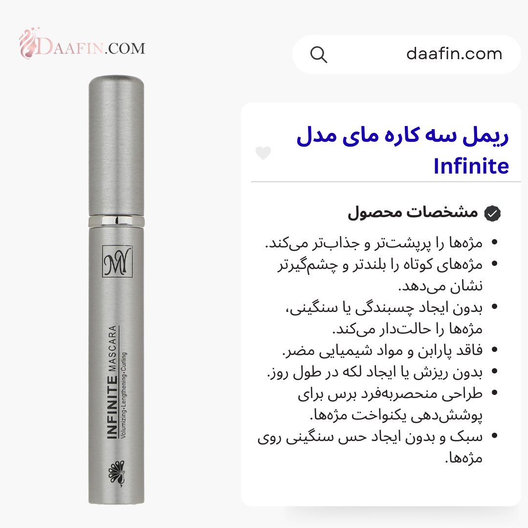 ریمل سه کاره مای مدل Infinite علاوه بر حجمدهندگی، تأثیر قابلتوجهی در بلند کردن مژهها دارد. این ویژگی باعث میشود مژههای کوتاه شما بهطرز قابلتوجهی بلندتر بهنظر برسند و حالت طبیعی و زیبایی به چشمها ببخشند. با یک بار کشیدن برس ریمل از ریشه تا نوک مژهها، میتوانید به ظاهری جذاب و چشمگیر دست یابید. همچنین، این محصول برای کسانی که مژههای کوتاه دارند، گزینهای ایدهآل محسوب میشود.