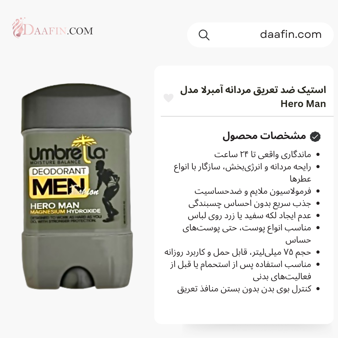 همین حالا ژل دئودورانت مردانه آمبرلا Hero Man 75 میلیلیتر را به سبد خرید خود اضافه کنید و فرق یک مراقبت مردانه حرفهای را تجربه کنید.